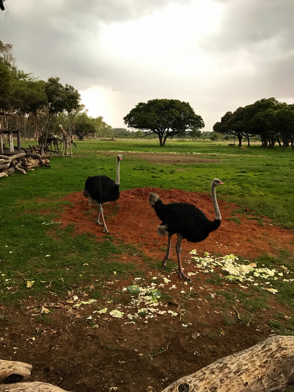 Ostriches hanging out while the elephants were fed